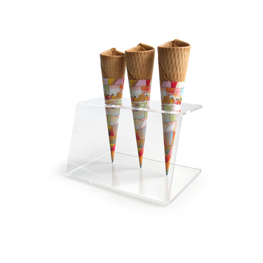 El servicono de metacrilato de tres servicios es un producto recomendable para la venta de helados en cono. Perfecto para situarlo en nuestra mesa de servicio y facilitar la entrega al cliente.
