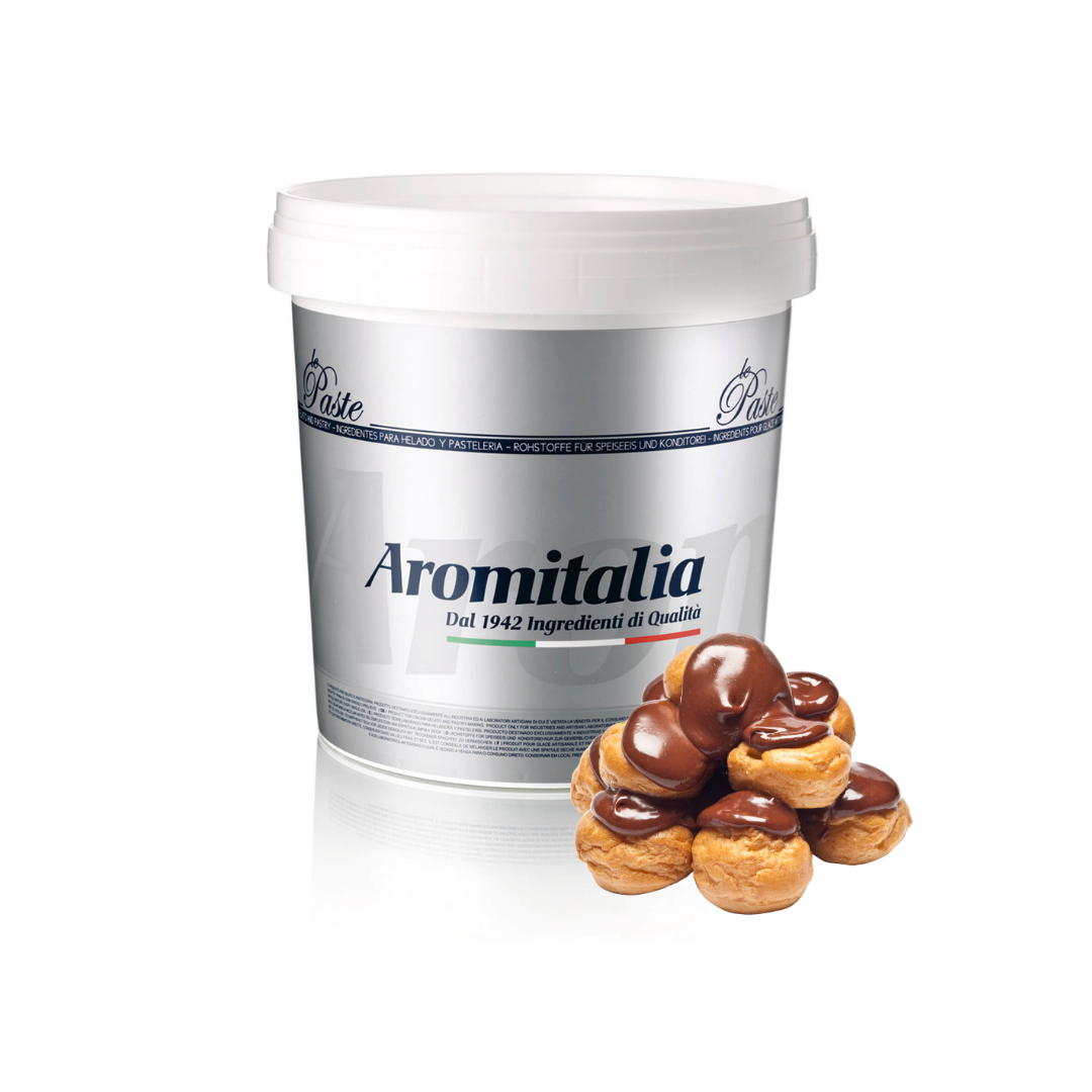 Este veteado con sabor del famoso postre francés Profiterole, esas bolas elaboradas con pasta choux y rellenas de crema pastelera, harán las delicias de tu heladería.