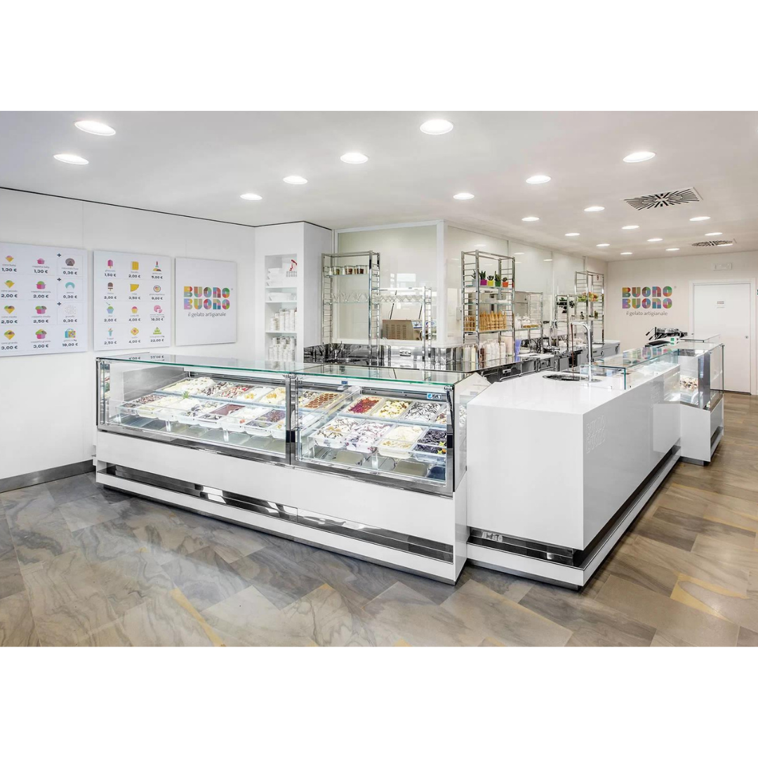 El helado como protagonista en el espectáculo del sabor. Esta vitrina nace de una combinación armónica de superficies, materiales y transparencias que revolucionan los prototipos de exposición del helado artesanal.