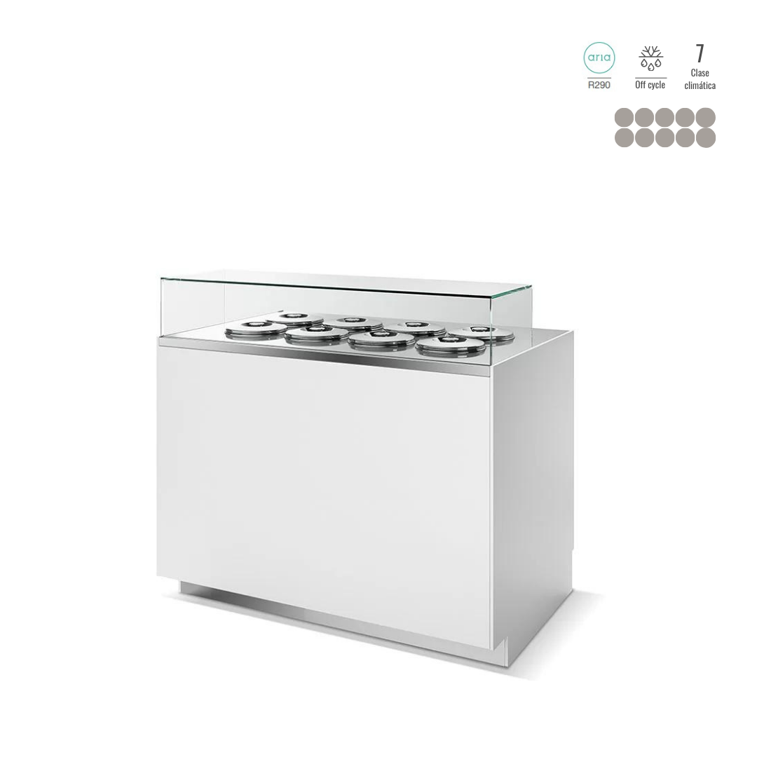 - La refrigeración por inducción estática garantiza una perfecta uniformidad de la temperatura del helado y es la última tecnología en términos de ahorro energético.